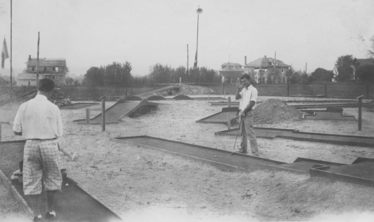 Over the next few years more land was purchased, including the dump. It was filled in and for two years, an 18- hole mini golf course dubbed Schnitzelbank was erected on that spot. In time the unsightly junk yard was removed and the park entrance on Main St. was constructed.  As for that initial effort to buy a sliding board for the children, the Park Association also maintained, for a few years, the little Noble Street Park.