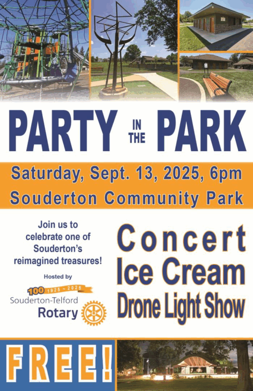 A:On Sept. 13, there will be a free concert, ice cream and a drone light show to celebrate the rebranding of the park to Rotary Park. There will be signs at three prominent locations as well as a donor wall to recognize Rotarian and community support. On Oct. 30, we will hold a centennial event for the celebration of the Souderton-Telford Rotary’s 100th anniversary.