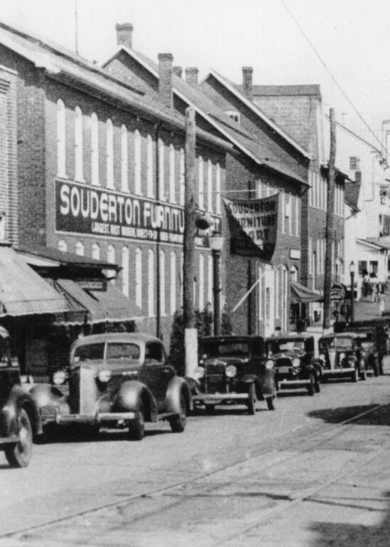 After the towel business closed, the building stood vacant for several years and even hosted an indoor carnival. In 1935, it reopened as the Souderton Furniture Mart – the painted name visible on the building for many years. Today, fully renovated, the building houses a variety of modern businesses.